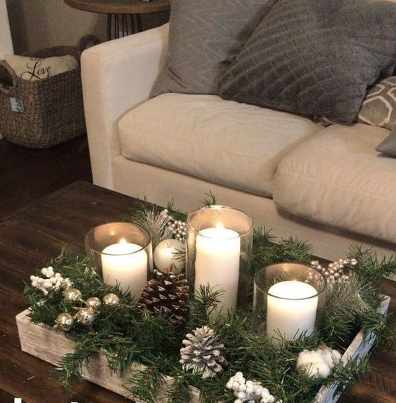 Si querés armar un centro de mesa quedan muy canchero los cajones. Podés usar uno de verdura y sacarle las tablas que le dan alto y después pintarlo. También podés usar una bandeja o plato amplio. Ramas verdes ayudan a rellenar y siempre van bien. Si te gustan las velas podes agregar varias, sino podés incorporar otros elementos decorativos como pelotas de Navidad como las que se ponen en el pino.