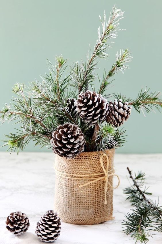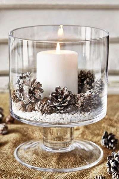 Elegí un copón o florero grande y rellénalo de piedras. Con eso podes hacer la base para que el velón no se mueva de lugar y quede bien firme. Las piñas pueden ser marrones naturales o si quisieras podes pintarlas un poco con blanco.