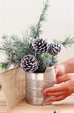 Si no tenés floreros o los que tenés no van bien con el tamaño, podés usar unas latas y cubrirlas con tela arpillera. También podés elegir otro tipo de genero si esto te parece muy rústico para tu espacio. Adentro podés colocar flores secas, ramas de pino, etc.