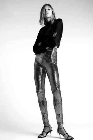 Los pantalones que más se están usando llevan lentejuelas. Desde unos leggings, pasando por unos skinny acampanados y hasta unos anchos de tiro alto que pueden ser parte de un traje sastre o no.