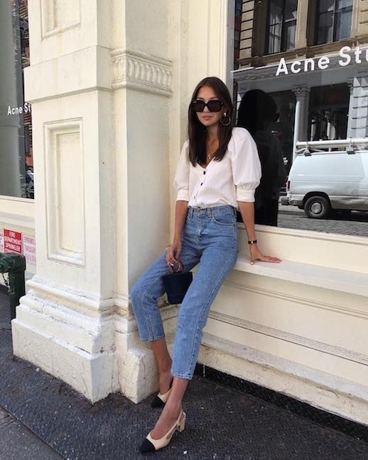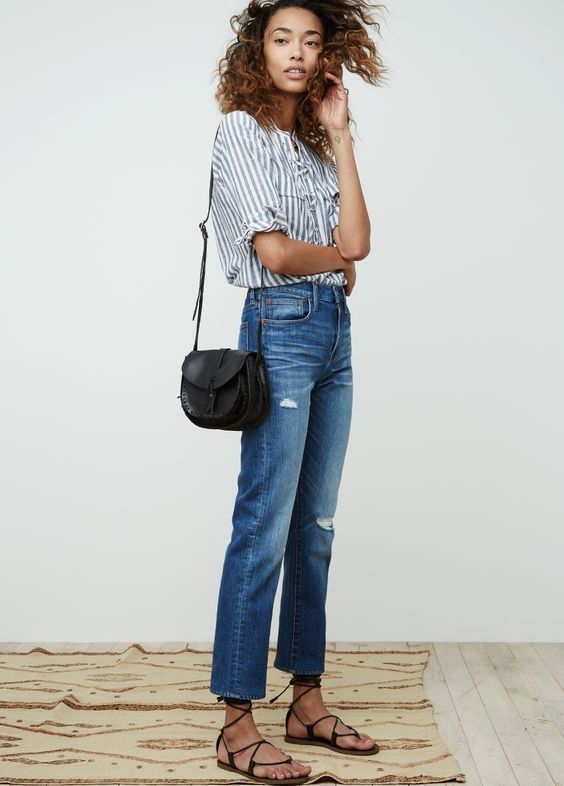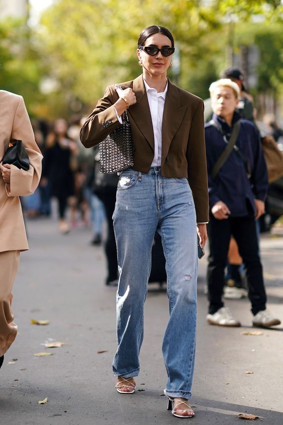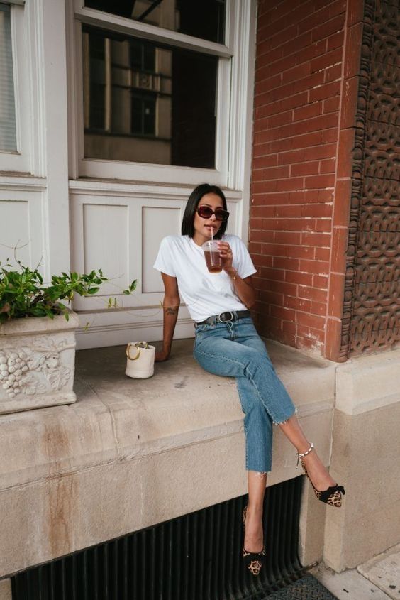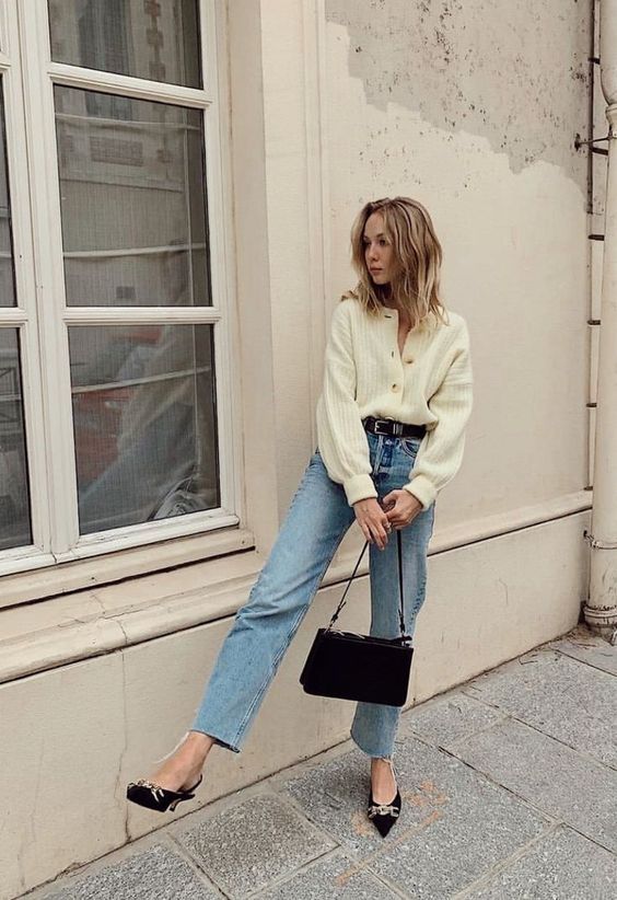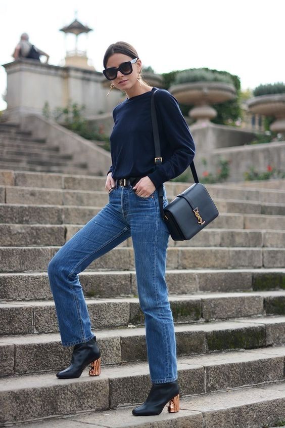 Entonces, ¿cómo usar jeans de pierna recta? Opta por pantalones rectos con cintura alta. En cuanto a la longitud, al tobillo es lo ideal. En la parte superior de tu look, úsalos con camisetas que se ajusten a tu cuerpo, sweaters cortos, camisas dentro de tus pantalones y remeras vintage.