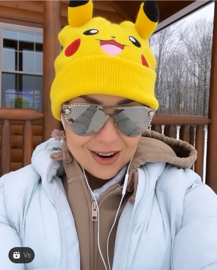 Esta vez Thalía conquistó las redes con un atuendo invernal, compuesto por una sudadera y un suéter en tono gris y marrón, un abrigo blanco acolchonado y un gorro amarillo con el rostro de Pikachu en la parte frontal.