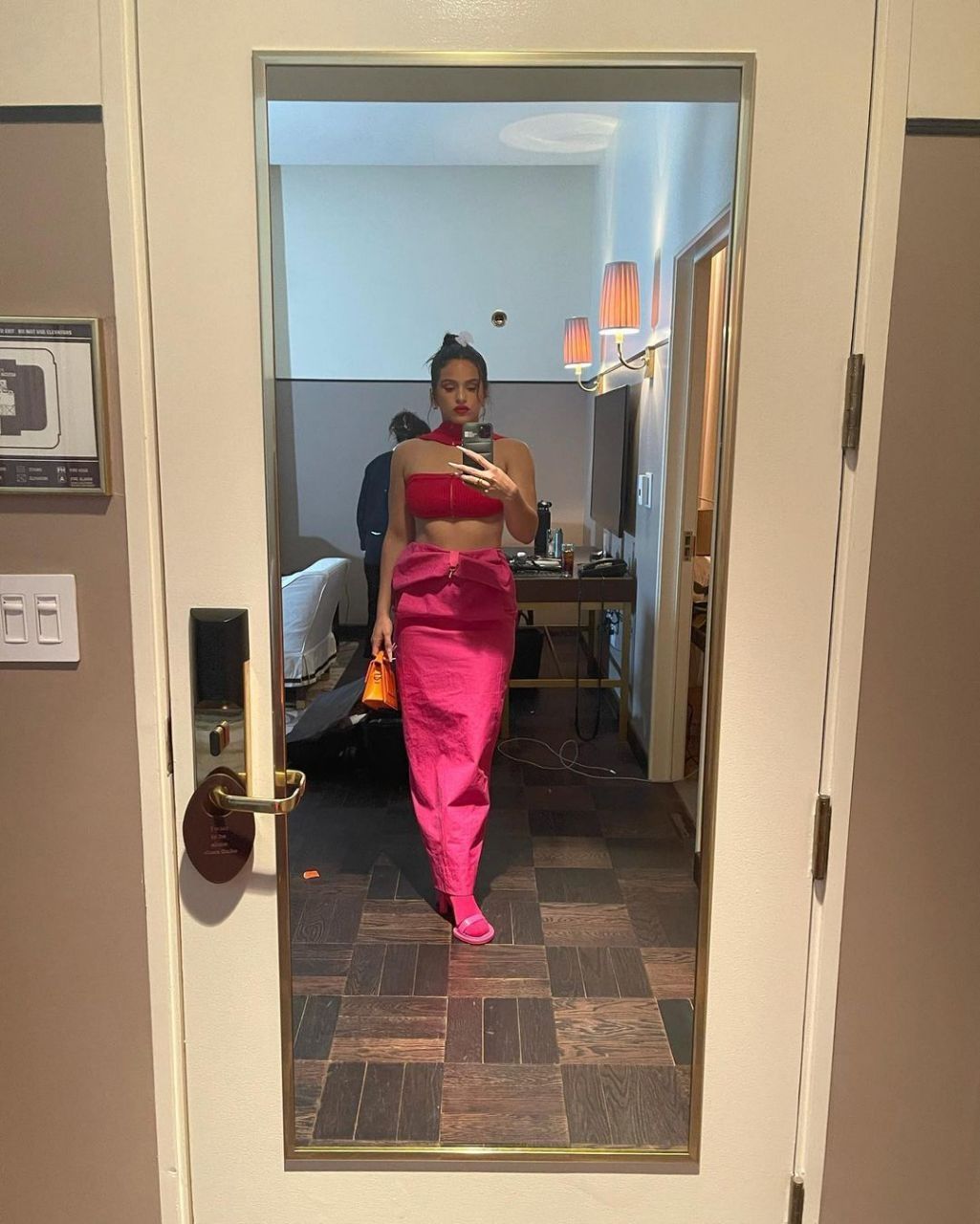 Rosalía eligió un vestido de dos piezas con top bandeau rojo y falda con cintura ajustada y corte recto en fucsia junto con unas medias y sandalias en el mismo color que su falda. Acompañó el look con una pañoleta de gasa roja que adornaba su cuello, una mini bag naranja y un maquillaje con atención en los labios rojos.