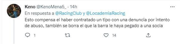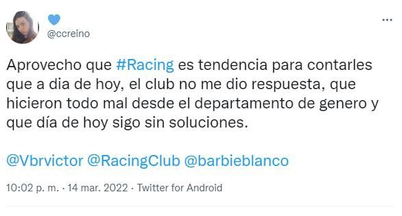 Como respuesta a ese comunicado, Carla Reino decía: "Racing y sus comunicados de mentira... Che, Victor Blanco, porque borraron las cámaras si no tenían nada que ocultar? Sigan mintiendo que ya se les cayo la careta, están haciendo todo mal".