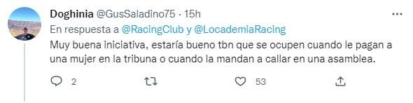 El debate -en todo caso a favor de la iniciativa de Racing- en torno a la lactancia materna y a la posibilidad de amamantar en cualquier momento y lugar, no fue el único al que hubo referencias en los comentarios. Muchos recordaron la falta de respuestas por parte del club a una mujer que fue golpeada en la tribuna. El hecho ocurrió en la previa del partido contra Talleres, en marzo.