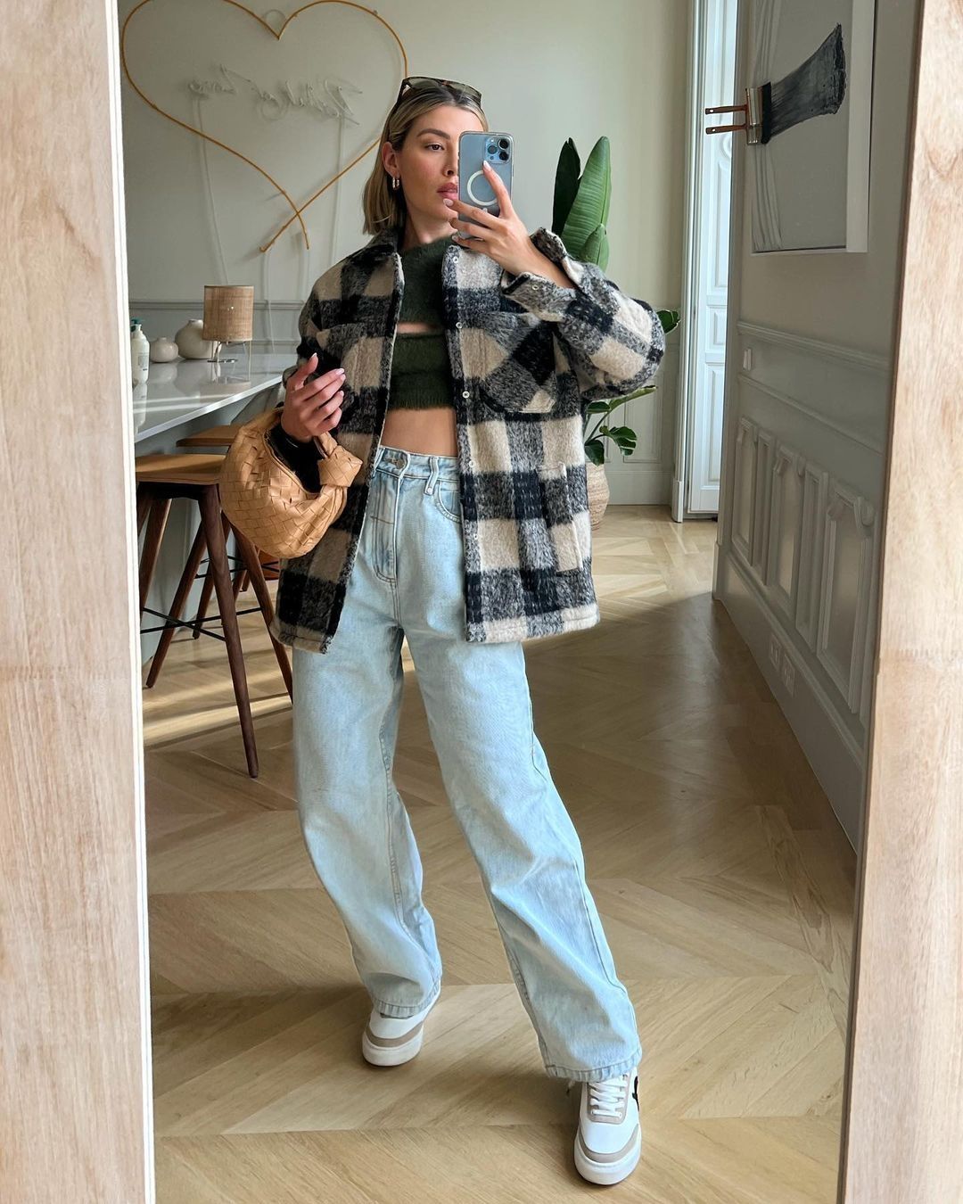 Como empezamos con el atuendo más elegante, terminamos con el más informal. Aquí, Michelle Salas nos enseñó su lado menos recargado o extravagante optando por sus jeans de la temporada junto con un crop top negro, camisaco con estampado a cuadros en beige y negro, zapatillas blancas y bolso marrón arena.
