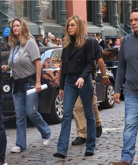 El toque extra se lo dio con un blazer. A diferencia de los conjuntos que se han visto recientemente en el street style y las pasarelas -donde los abrigos livianos oversize abundan-, Aniston apostó por un saco de estilo cropped. ¿Cómo completó su outfit? Con unas botas de gamuza de punta triangular, un clásico que nunca falla.