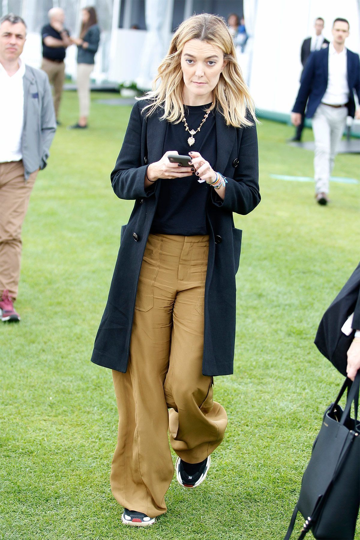 La empresaria combinó un sencillo jumpsuit de Zara en rosado té con pantalones slouchy y lazo en la cintura junto con un tapado en verde militar y sandalias marrones estilo romanas pertenecientes a la firma de lujo, Chloé.