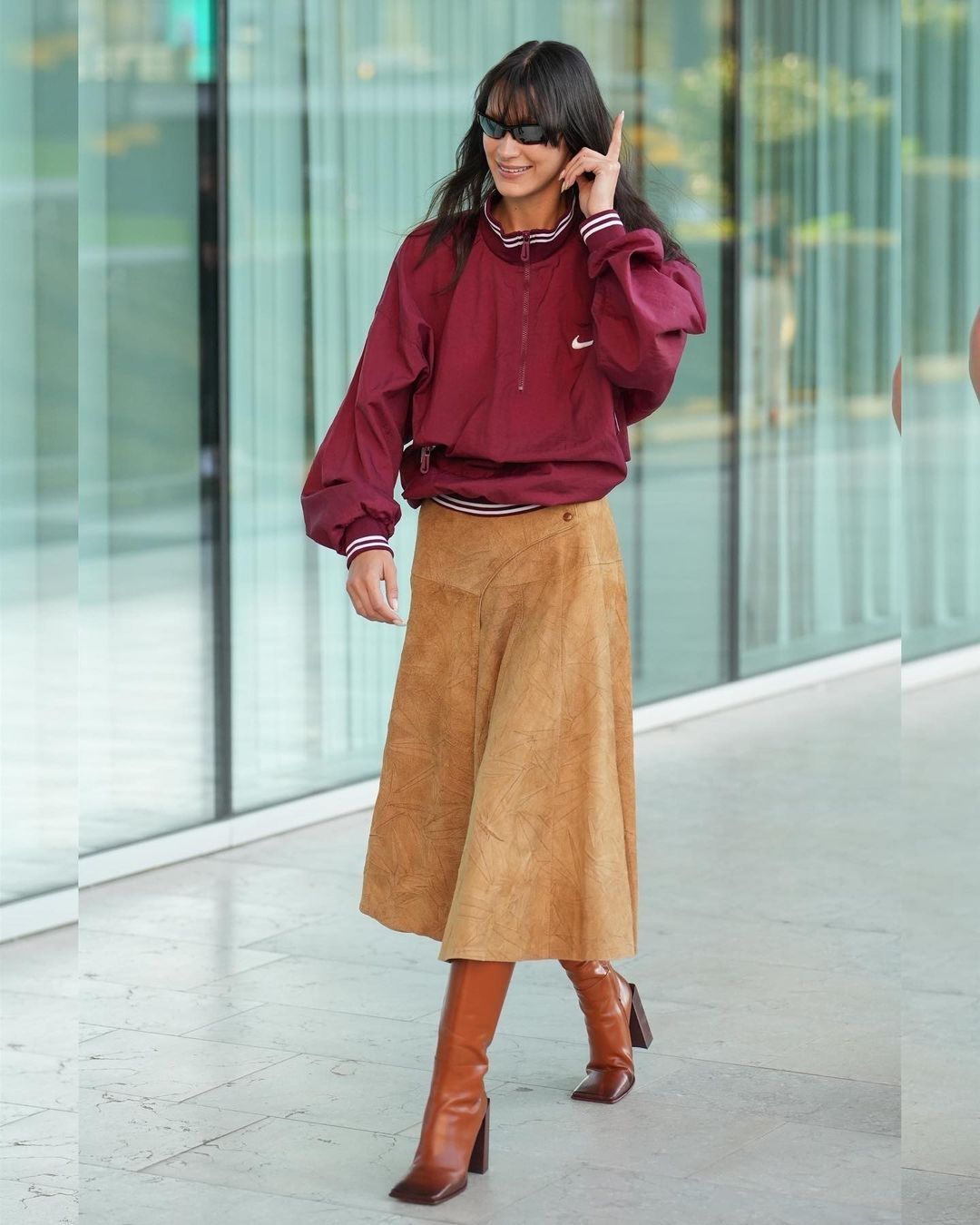 Al salir del desfile, se la pudo ver con una falda midi plisada de ante beige, botas marrón camel con punta cuadrada, chaqueta bomber bordó de Adidas y gafas de sol. Un atuendo que combina una prenda elegante como una falda de ante junto con una chaqueta deportiva. ¿Te animas?