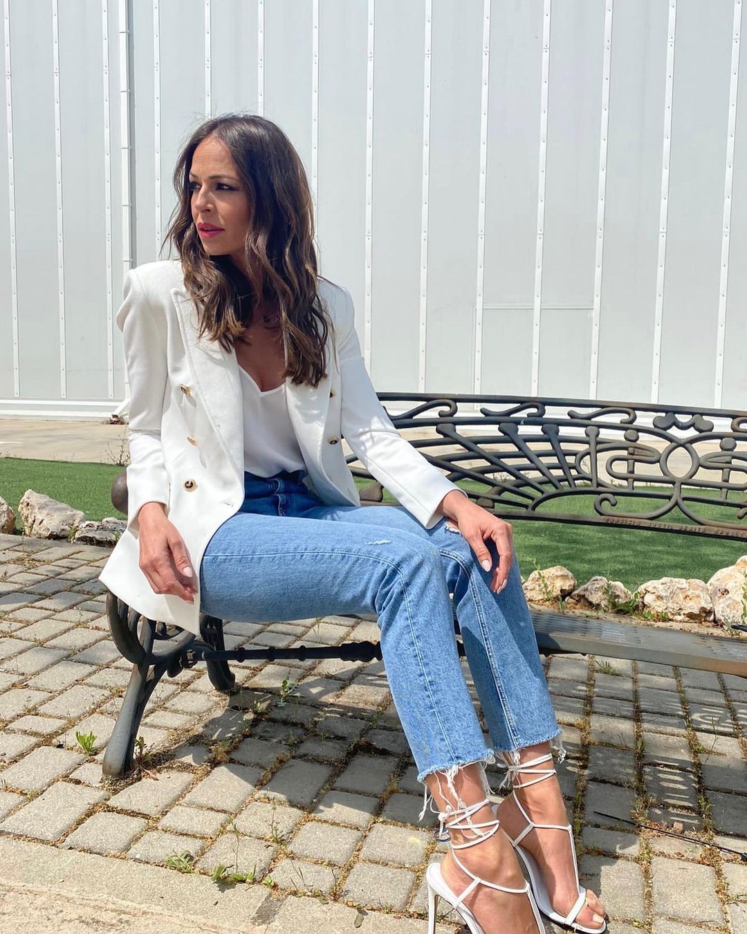 En el caso de Eva González, la diosa sevillana optó por unos skinny jeans con algunos toques rasgados para descontracturar el look. Junto con un top blanco y un blazer al tono con botones dorados, mezcló clásicos y tendencia, y respetó la regla de los tres tonos: el principal, el blanco, en menor proporción el tono jean y, por último, los detalles en dorado, ¡una bomba!