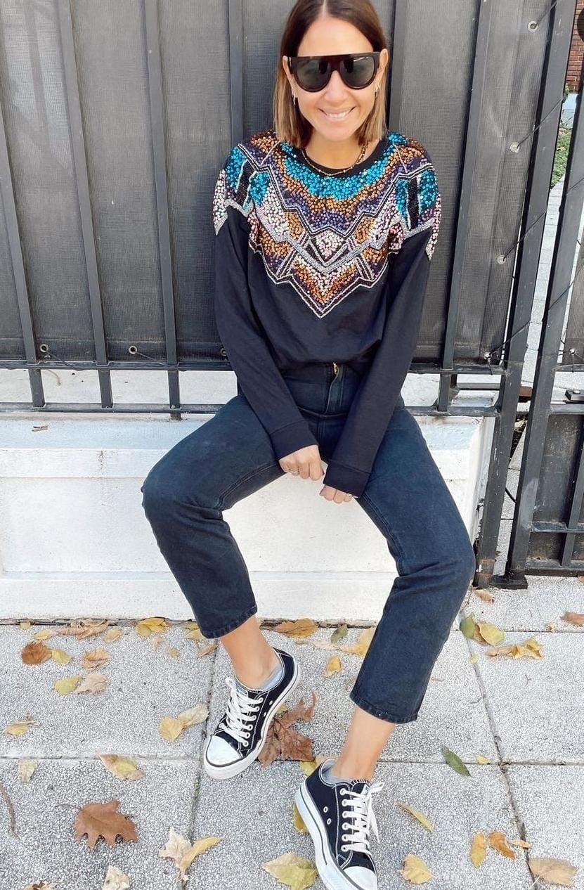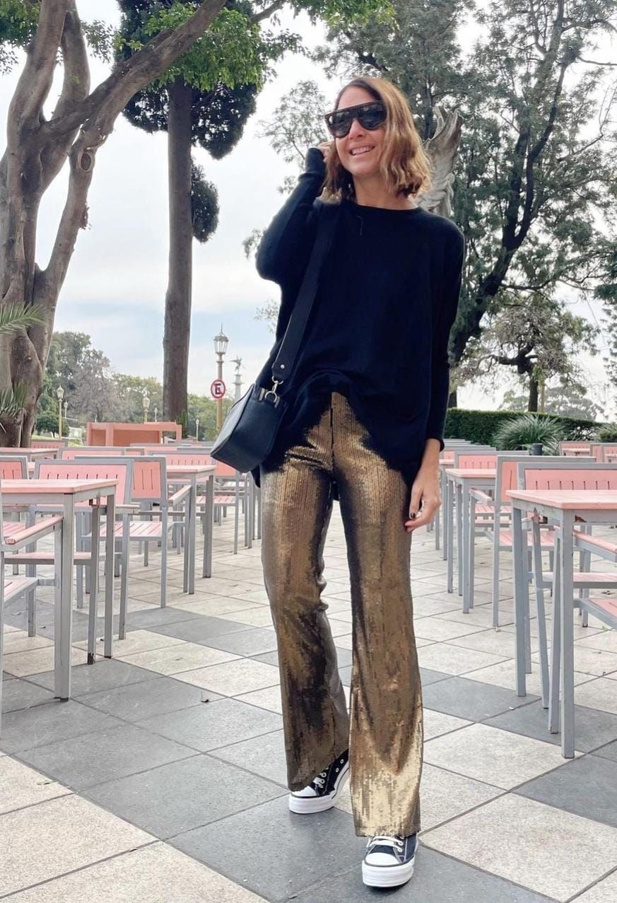 Usá un prenda inferior de lentejuelas o bordada combinada con una remera básica o un buzo con capucha, así vas a lograr poder llevar de día prendas típicamente pensadas para la noche.