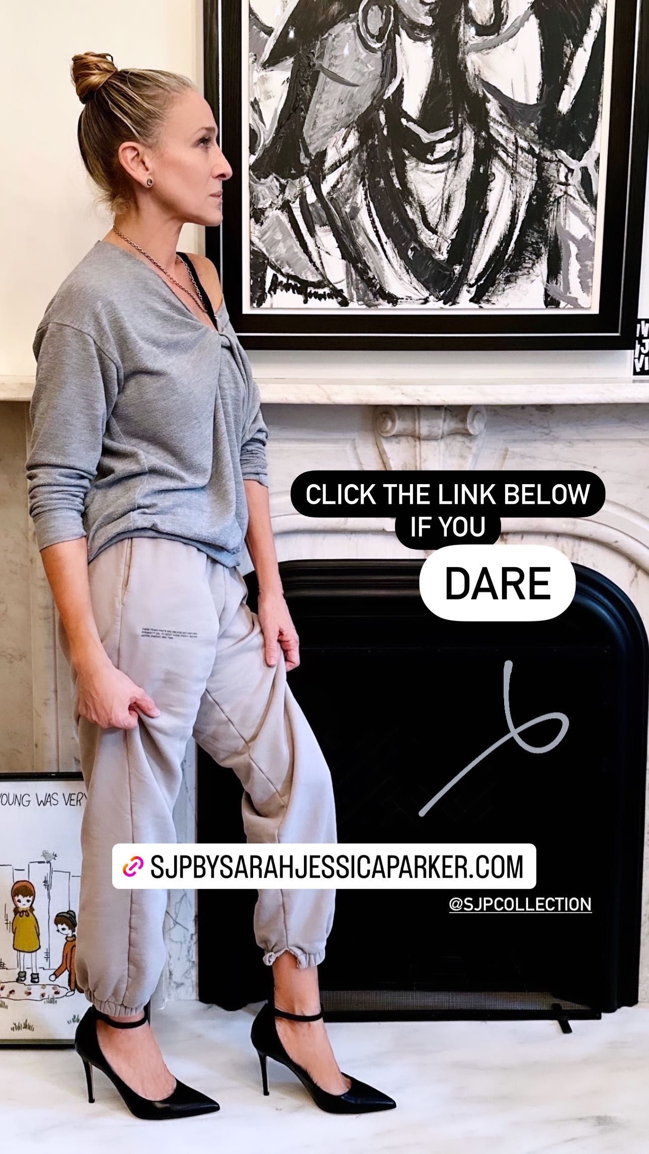 Al volver a postear en redes sociales, las alarmas de estilo volvieron a sonar en el mundo. Sarah Jessica Parker mostró un look mezclando su estilo relajado con tacones negros clásicos y extra altos pertenecientes a la nueva colección de su firma de calzado. Aquí, la actriz publicó un atuendo de pantalones jogger corte slouchy en gris claro con un sweater gris holgado de escote en V.
