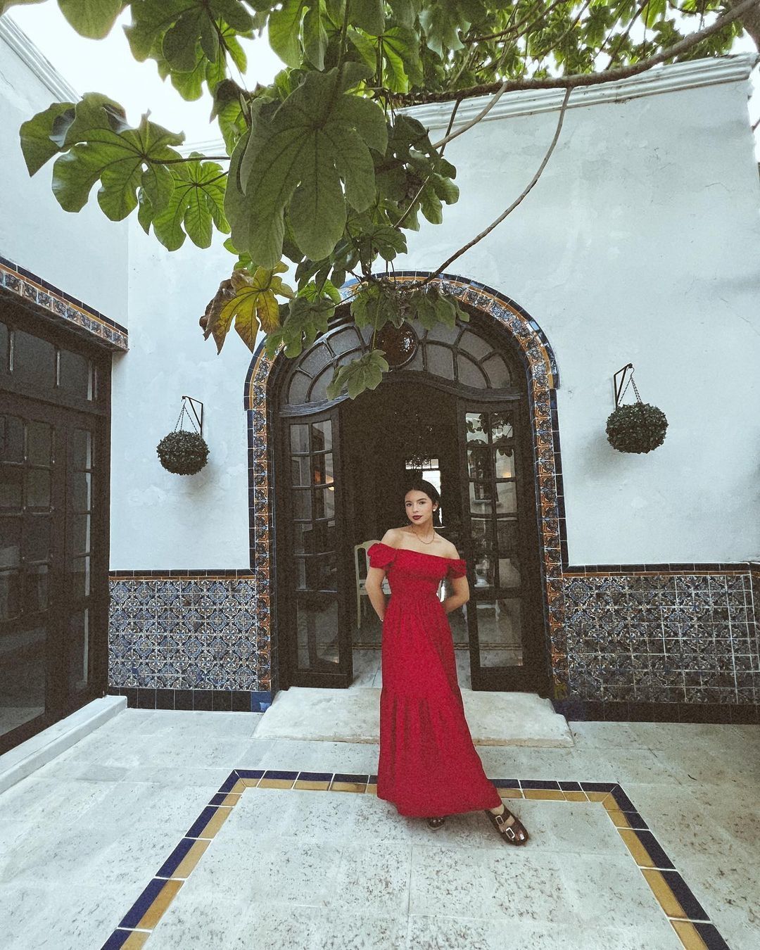 La cantante regional, no obstante, no escatima en glamour cuando baja del escenario. Y aunque este vestido rojo largo es de tela sin brillos y con una propuesta de escote sensual, pero casual, el fuerte de su diseño es el tono encendido, las clavículas y los hombros al descubierto con un frente tradicional mexicano y la falda larguísima que cae luego de una ceñida cintura con frunces.