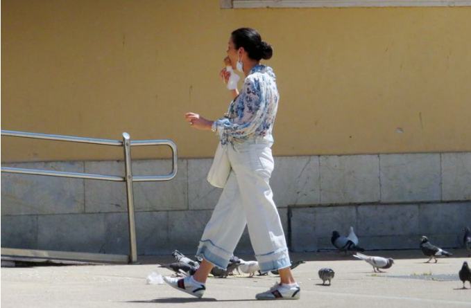 El protagonista de su outfit son los jeans de tiro alto y de color blanco. El detalle de su glamour es el efecto desteñido y desflecado al final del corte cropped. En este caso, ella lo ha combinado con unas zapatillas deportivas dándole un toque más casual.