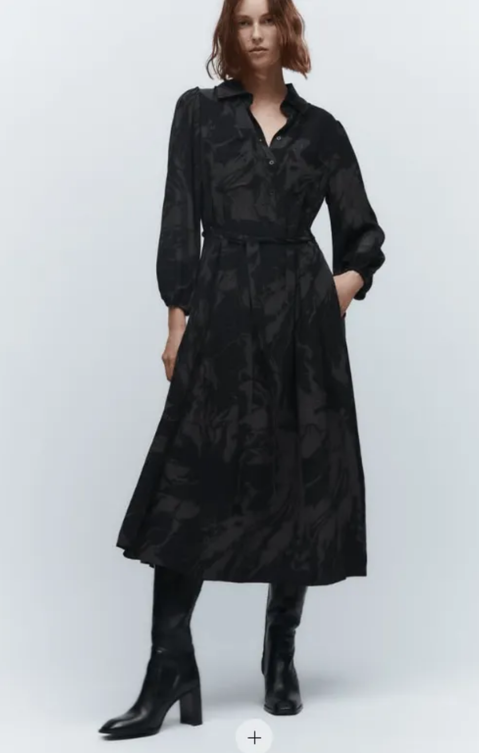 Los vestidos camiseros serán la estrella de las rebajas, ¡aprovecha a sumar un clásico en negro con trama floreada para un total look con botas de caña alta!