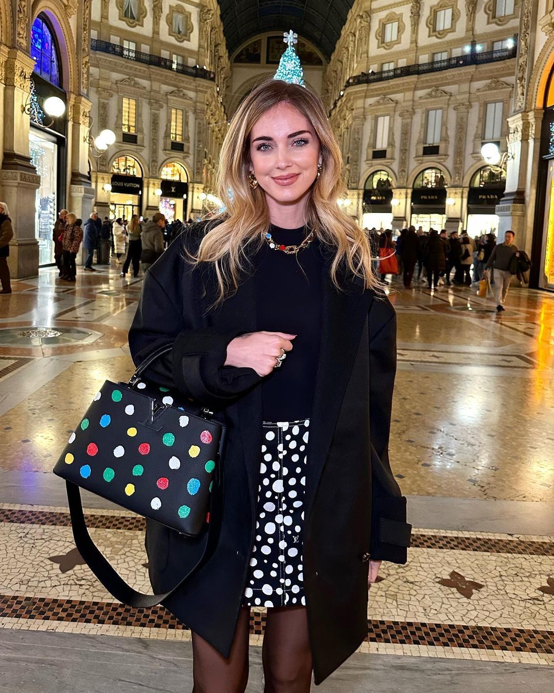 Chiara combinó su complemento estrella con una minifalda negra estampada con círculos blancos, sweater negro, tapado negro, medias translúcidas y collar dorado con cuentas de colores. Un look invernal y chic que logró que su bolso Louis Vuitton se luciera increíble con todo su conjunto.