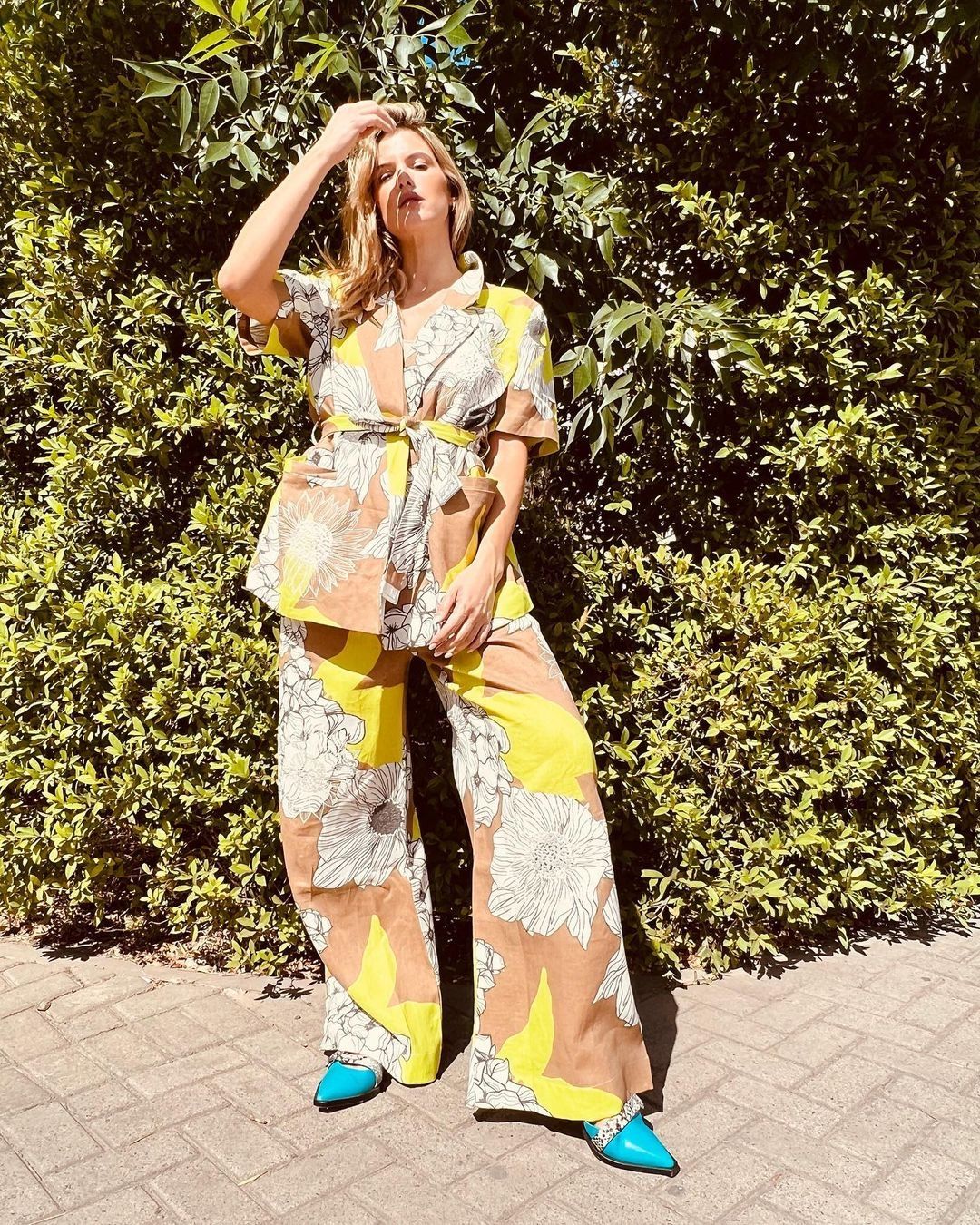 Los estampados tropicales o florales están a la orden del día durante el verano. Son una compra necesaria y tan versátil que luego la usarás todo el tiempo y en toda ocasión. Para inspirarte, buscamos este look de Mery del Cerro en el que optó por un conjunto con grandes flores y en color marrón camel, amarillo, blanco y negro. Acompañó con unos zuecos turquesa con apliques de moños animal print, todo firmado por la marca Justa Petra.