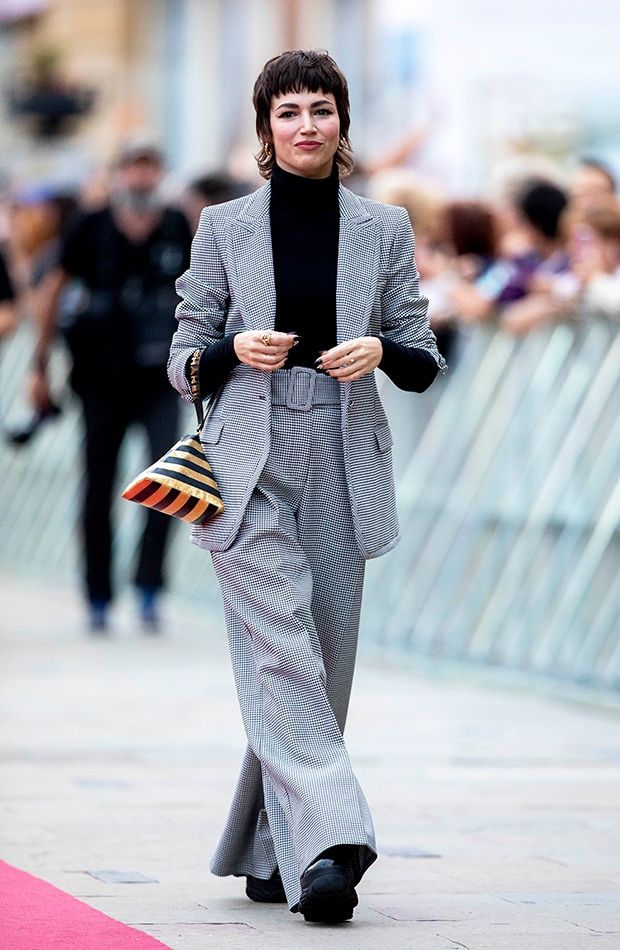 Al principio, los trajes solo eran para hombres y a medida que fue pasando el tiempo, distintos diseñadores como Yves Saint Laurent lo fueron popularizando para la mujer. Hoy en día es muy común mezclar en un traje de mujer elementos más masculinos y viceversa. Este es el caso de Úrsula Corberó que eligió un traje gris a cuadros de blazer largo y solapas grandes junto con unos pantalones baggy.