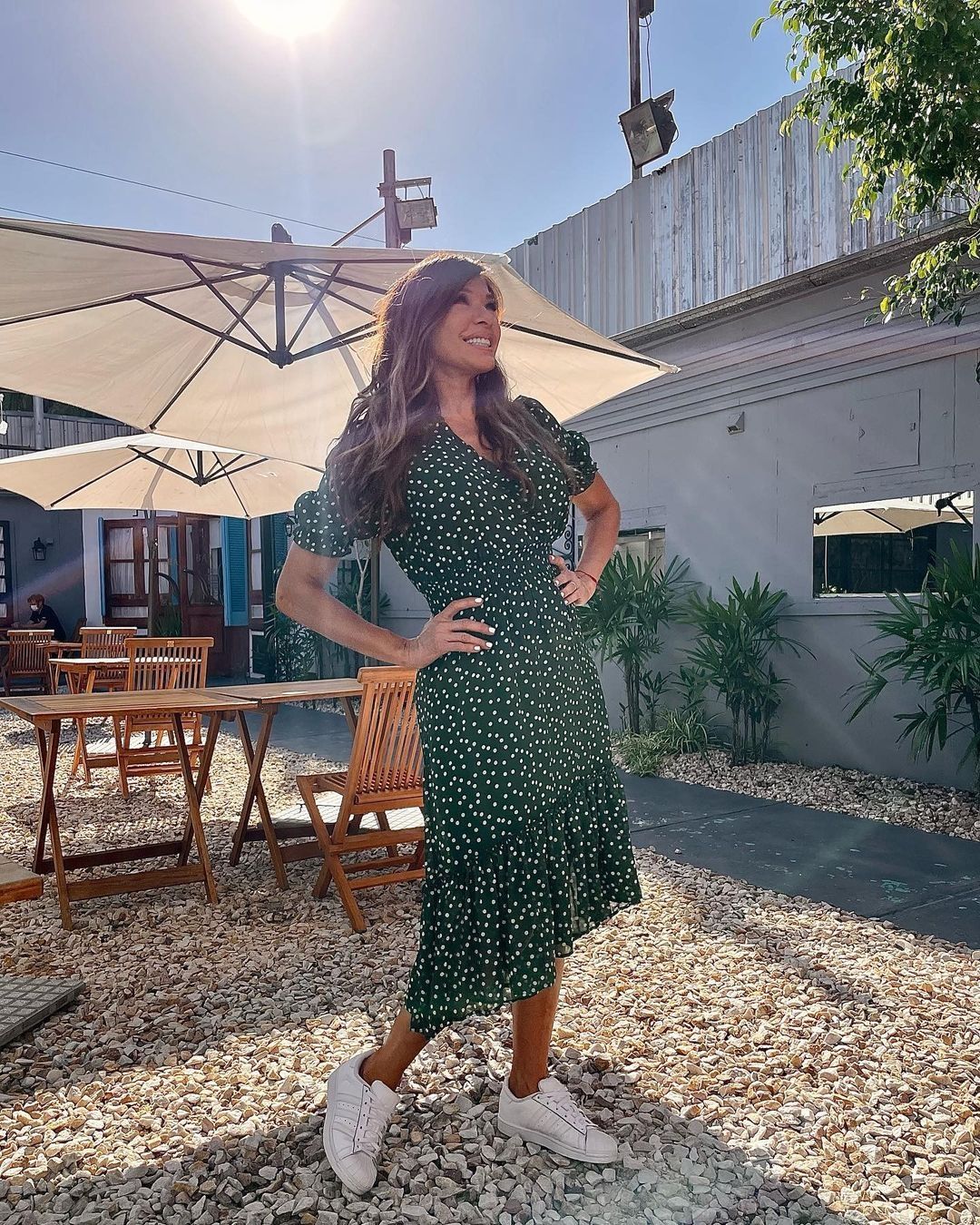 Aquí, vemos a Catherine Fulop luciendo divina con un vestido midi verde de puntos blancos que combinaban con sus zapatillas. Este vestido es perfecto para las mujeres que desean obtener una silueta reloj de arena con una sola prenda.