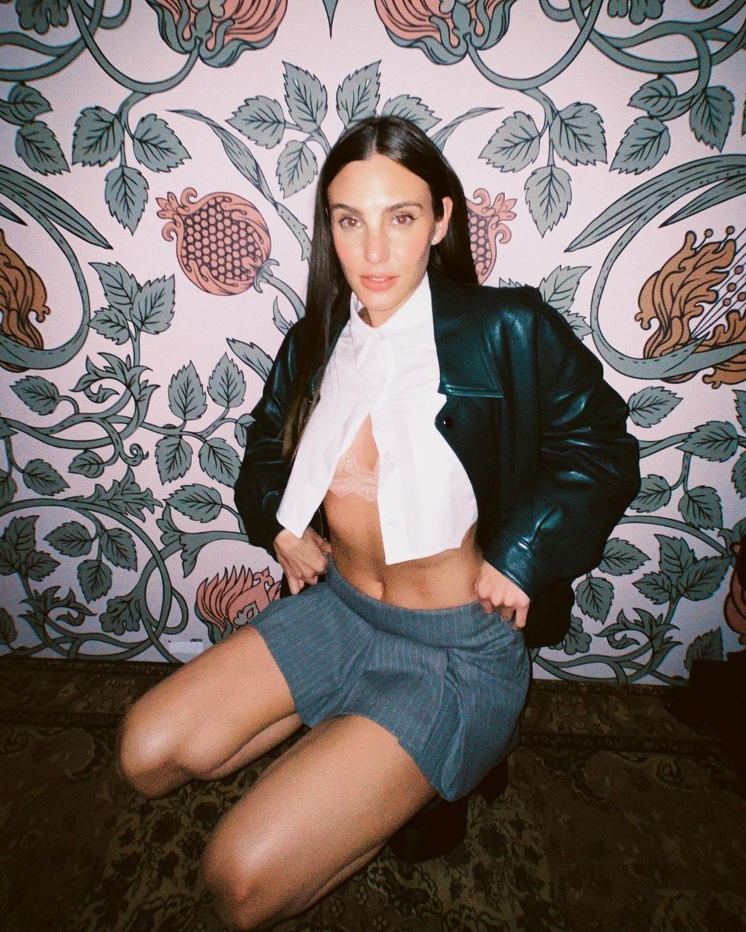 Una idea que puedes usar para incorporar los bralettes a tus looks es combinarlo como Macarena Achaga, mostrándolo sin dejar que se vea de manera muy explícita. La actriz probó con un sostén rosa nude y apliques de hilos brillantes que combinó con una minifalda gris tableada y con estampado de raya diplomática , camisa cropped blanca, chaqueta holgada de ecocuero negro y botines negros con plataformas.