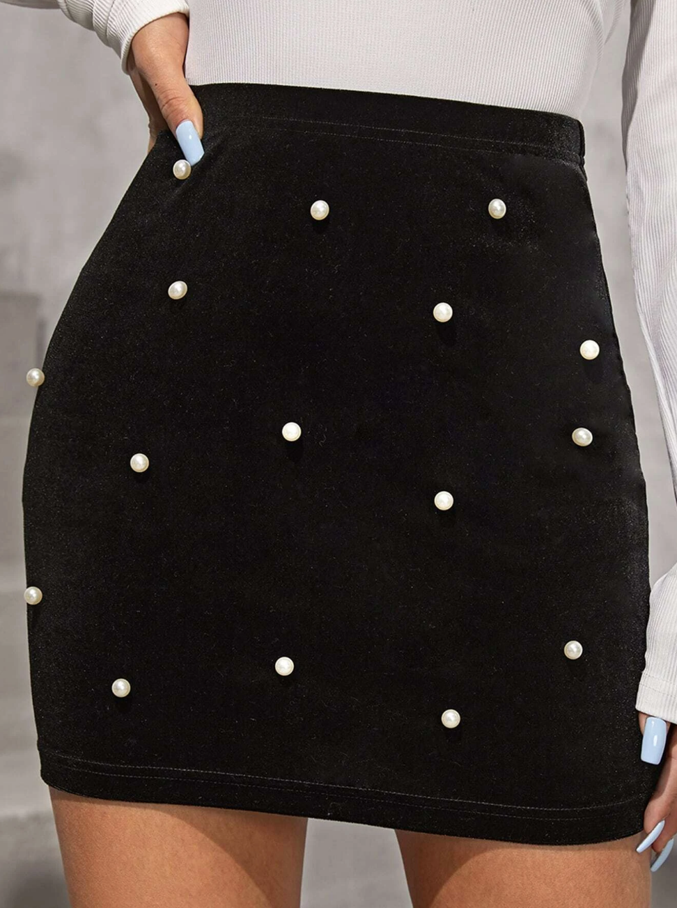 La falda de Shein que recibe el nombre de “BAE“ está confeccionada en terciopelo negro y cuentas de perla. Es una prenda versátil y elegante que puede ser utilizada en una variedad de ocasiones.