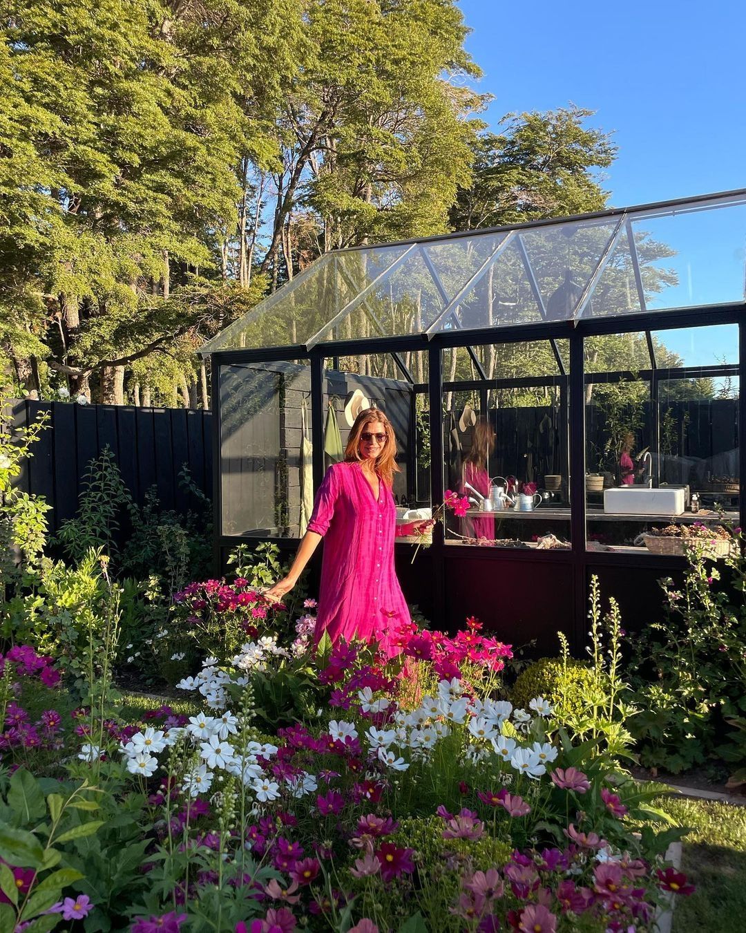 En este caso y para estar cómoda mientras trabaja en su jardín lo combina con sandalias bajas en tono crudo y elige un tono vibrante y en tendencia como fucsia para no necesitar nada más para estar espléndida.