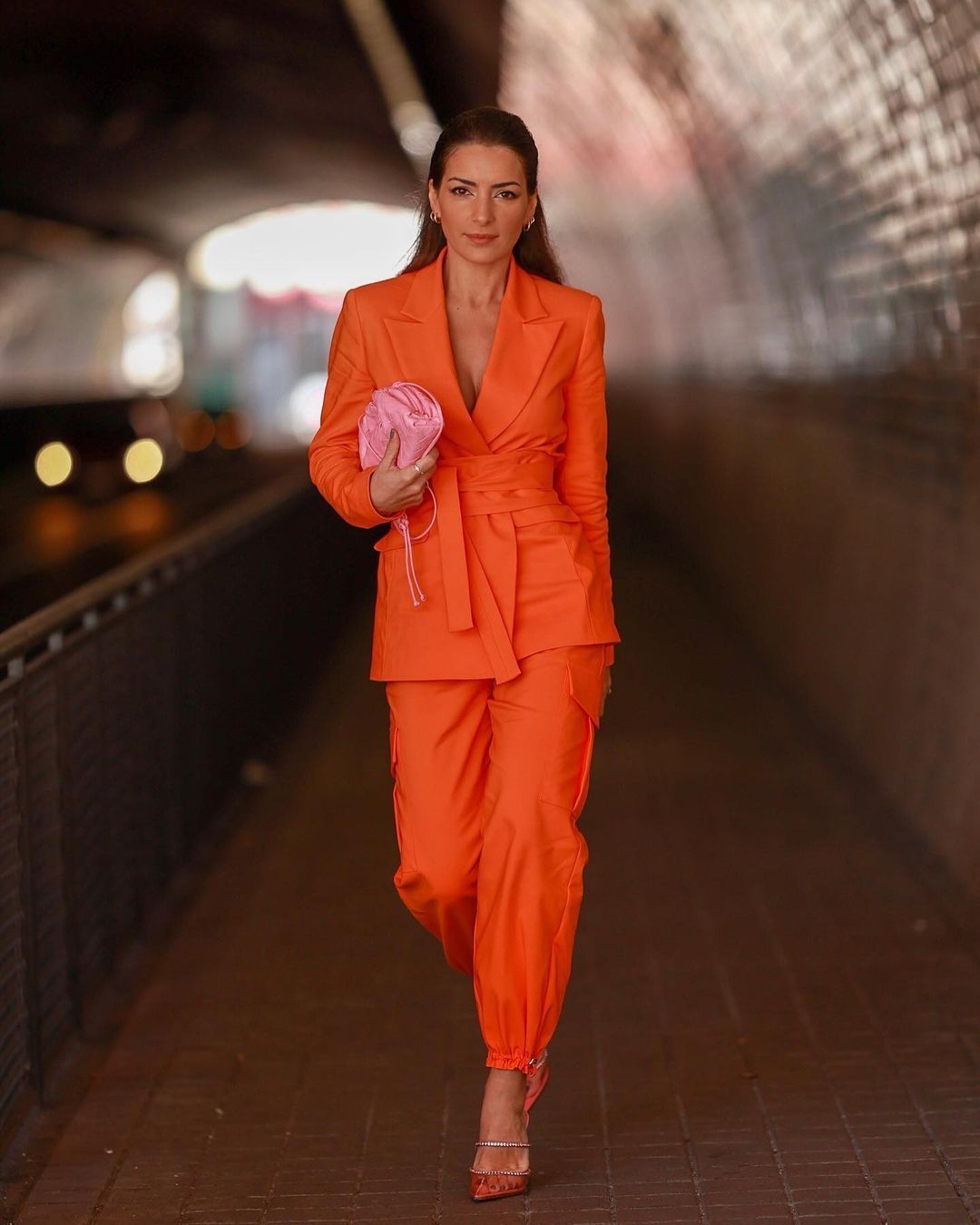Este conjunto de sastrería de Zara se enfoca en volver protagonista a uno de los colores de la temporada: el naranja fuerte.