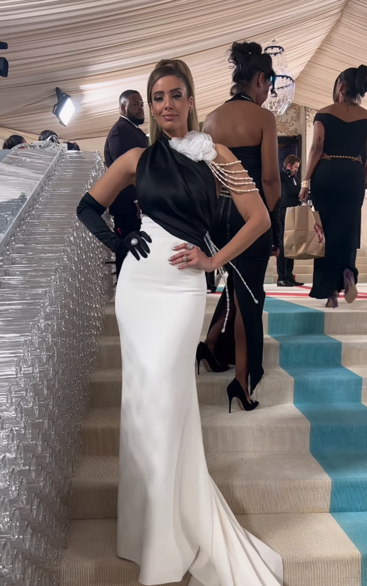 Con detalles sobre la parte delantera del vestido como falsos breteles de perlas y una flor, un solo guante sobre el brazo contrario al detalle de joyería aplicada y un vestido bicolor en blanco y negro, corte sirena, la espalda se llevó los aplausos del diseño de Bride to Be, una firma sostenible dedicada a madrinas y novias.