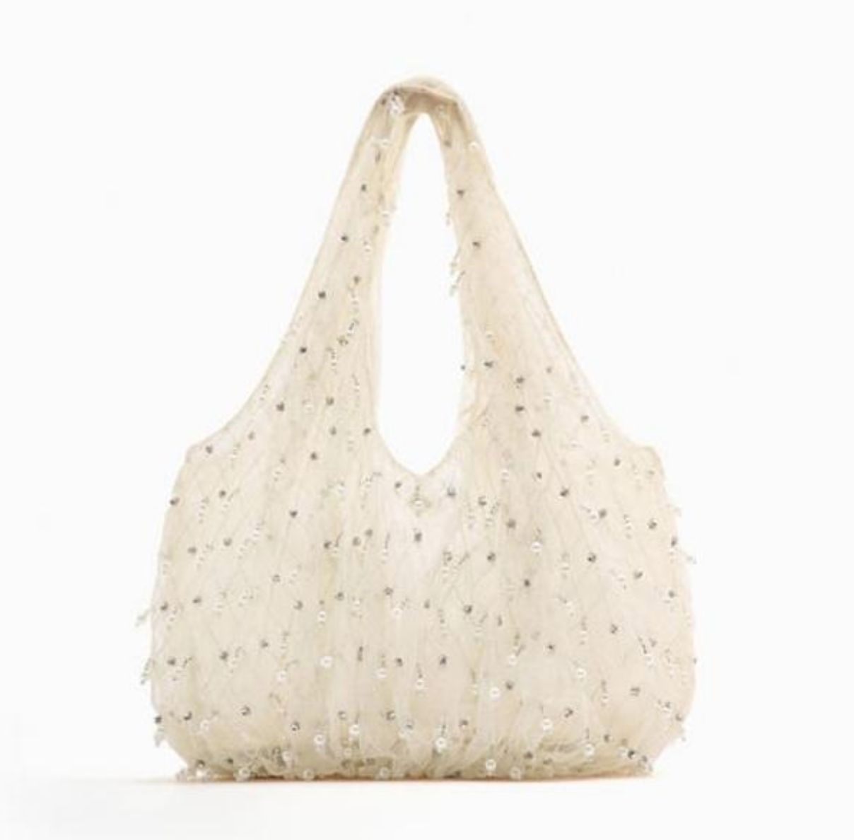 Confeccionado en organza de color blanco y con una asa corta, está adornado con lentejuelas a tono que agregan un toque de brillo y glamour a cualquier outfit.