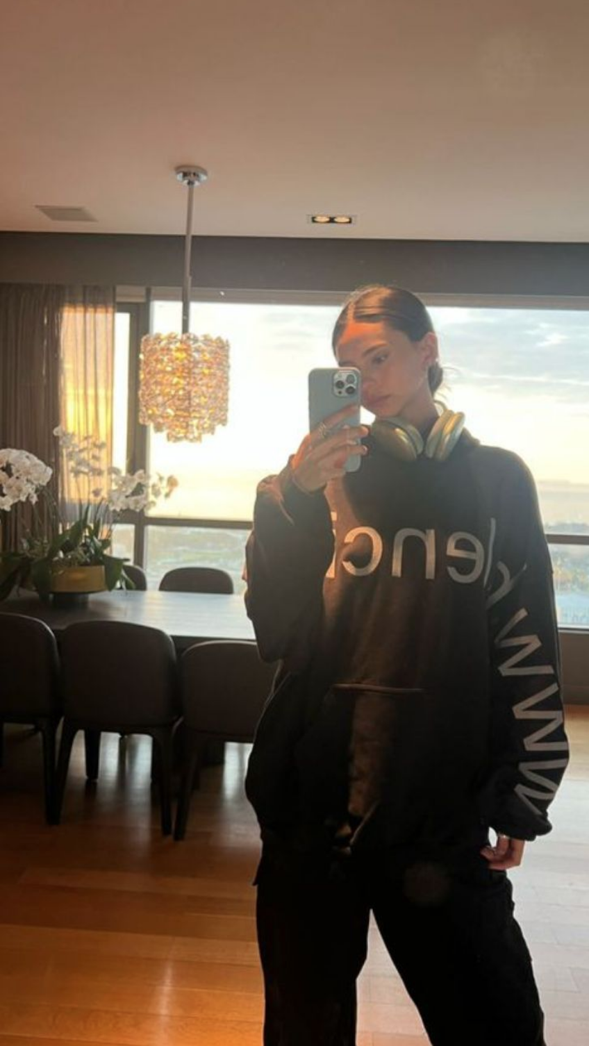 La pieza central de su atuendo es un buzo de corte oversized firmado por Calvin Klein. El estampado de las letras en blanco en vertical y con tipografía XL es el único contraste con el tono oscuro del buzo, aportando un toque minimalista al outfit.