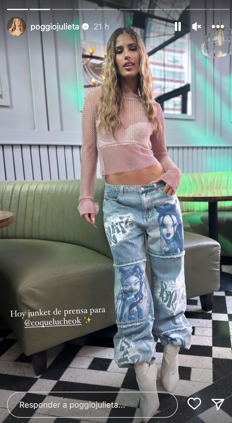 Dejando atrás el clásico rosa Barbie, Julieta optó por un par de vaqueros estampados con dibujos animé en negro, una elección super atrevida que, además, fusionó con el toque estético Y2K.