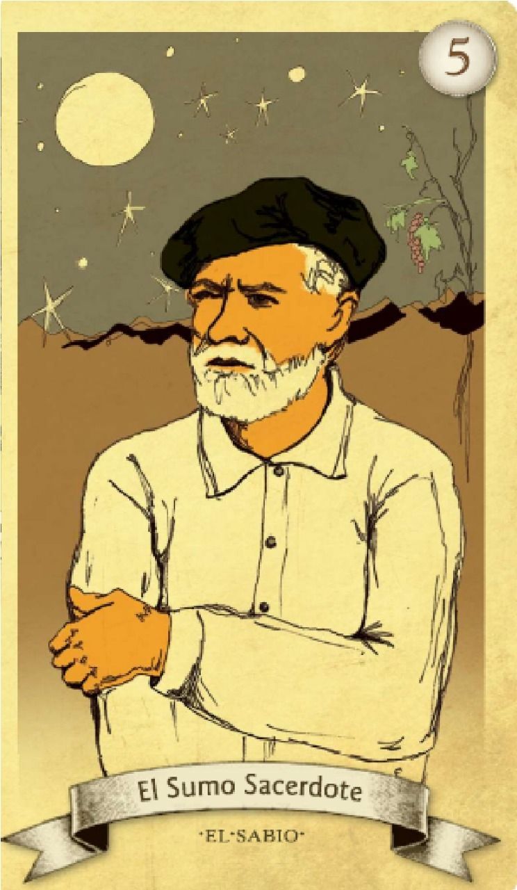 En los arquetipos antiguo esta figura representa a los sacerdotes, monjes, como un canal de sabiduría divina, en este tarot lo llevo a la capacidad que da la experiencia, el tiempo, la observación. Bernardo Razquín personaje del siglo pasado mendocino fue andinista, investigador, arqueólogo y meteorólogo autodidacta. Por su observación meticulosa de los cambios en la naturaleza, en el cielo y sus movimientos, en las plantas locales y en los animales podía determinar pronósticos acertados del tiempo.