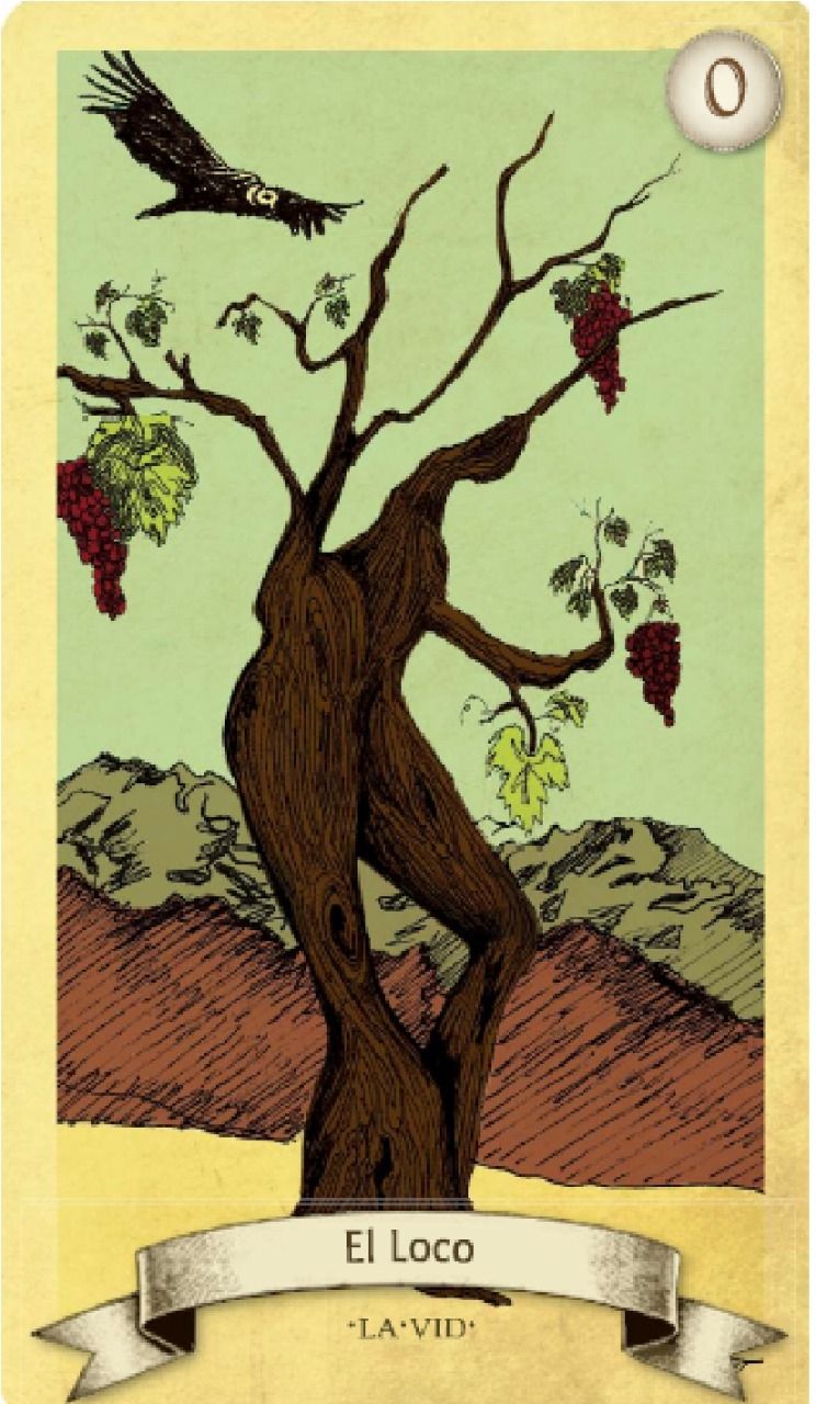 La figura del loco muestra alguien que deambula sin sentido ni dirección, en esta carta vemos la vid, como planta silvestre toma la dirección que la lleva su sentir, su naturaleza;los viñedos y parrales son dirigidos por la mano del hombre.