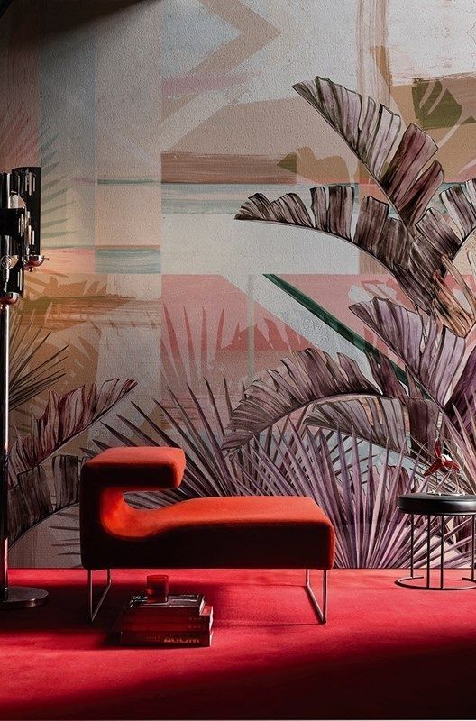 En la siguiente imagen, se forma un espacio que parece salido de la TV. Es que la forma del mobiliario en conjunción con el color y la alfombra da un aspecto teatral o escenográfico a la imagen. De fondo acompaña un mural que engama con estas tonalidades.