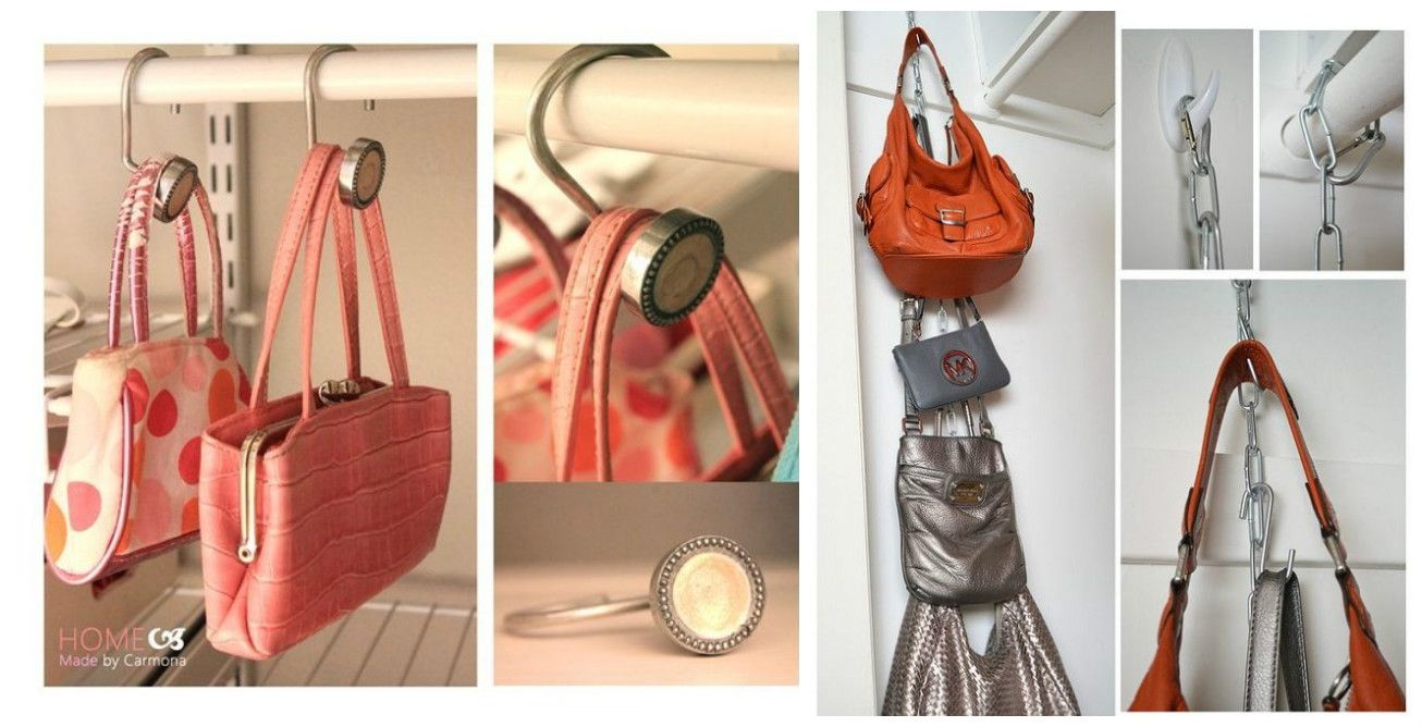 Si no tienes lugar para colgar un perchero y quieres mantener tus carteras fuera de la vista, lo ideal es comprar ganchos tipo barral para colgarlos junto con la ropa, y por otro lado ir agregando perchas a medida que tu colección aumente.