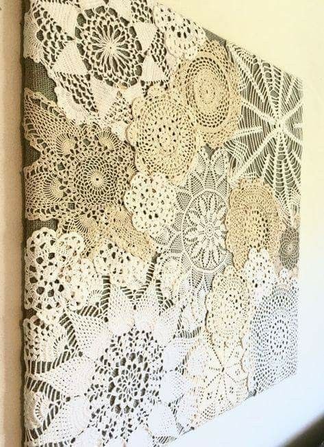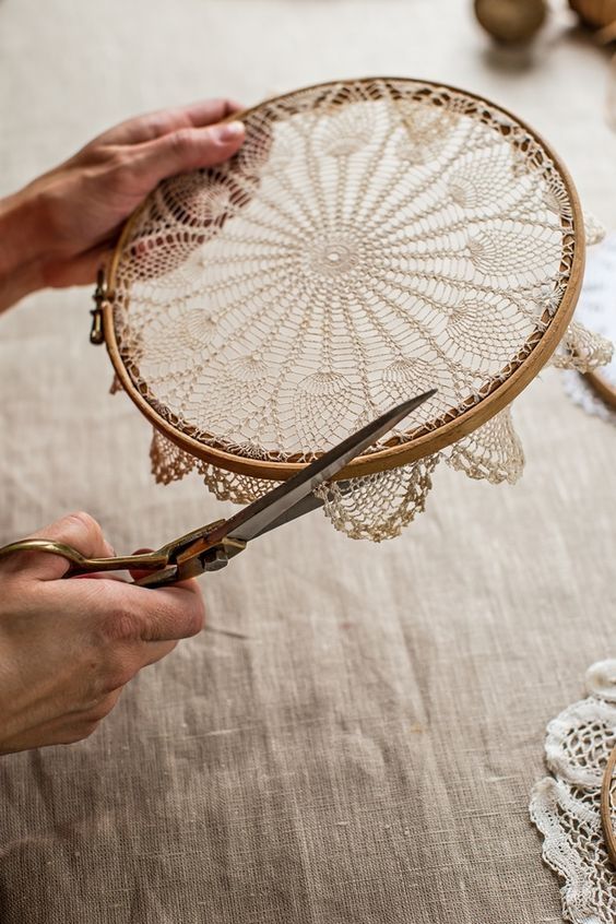 Si tenés blondas de papel viejas o este estilo de elementos tejidos ya sea redondo o cuadrado, lo ponés en un bastidor de bordado. Ese mismo bastidor te va a servir para colgarlo junto con los otros que tengas y armas un muro texturado único también.