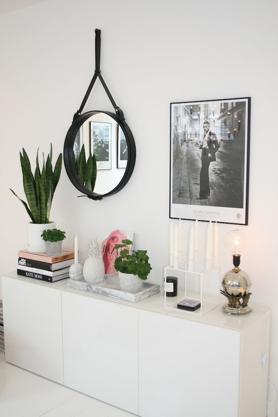 Es el opuesto al ejemplo anterior. En este caso hay otro elemento en el muro, por ejemplo un cuadrito. Este espejo es más pequeño que los anteriores, para no competir con los demás objetos, sino complementar.