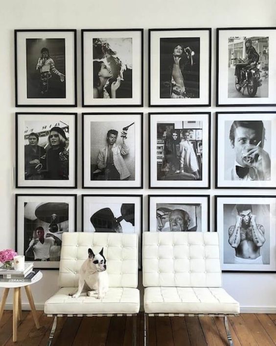 Muro blanco, con marco negro y fotos en blanco y negro. Este tipo de composiciones es una de mis preferidas. Si las fotos son propias solo hay que pasarlas a blanco y negro, no hay tanto problema de edición. Ideal para espacios modernos o para modernizar algún ambiente que sea un poco retro.