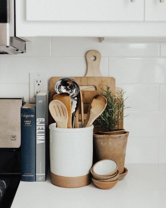 - Organizadores: son fundamentales para mantener el orden, porque nos permiten agrupar los objetos. Por ejemplo, cilindros de cerámica para cucharones y objetos altos. Las tablitas de cortar todas juntas y lo más importante es ordenarlas en vertical para que no ocupen tanto espacio.