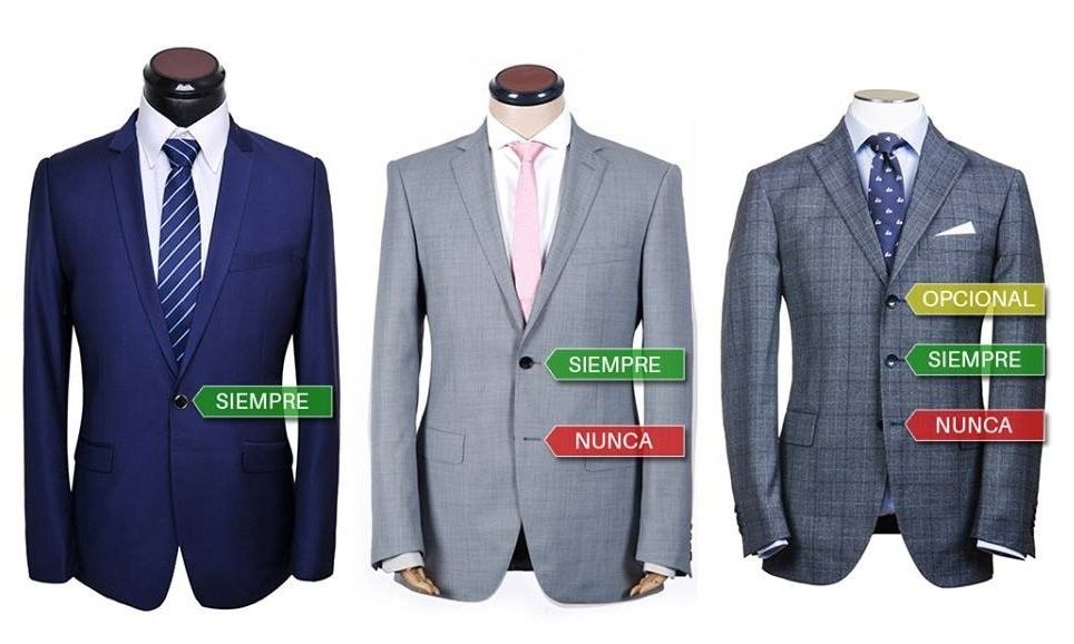 · Como norma general de cierre de botones recuerda esta regla; siempre, a veces y nunca. El primer botón siempre cerrado, el segundo a veces, el tercero nunca. Es decir si llevas un traje de tres botones debes cerrar el primero siendo opcional el segundo y dejando el tercero desabrochado. En el caso de dos botones debes llevar el primero siempre cerrado y el segundo es opcional. Un traje de un botón irá siempre cerrado. Otro dato importante es que al momento de sentarte debes desabotonar todos, sin excepciones.