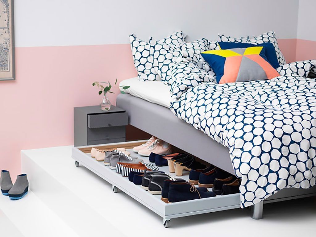 Ese espacio debajo de la cama es otra gran oportunidad para guardar los zapatos, la mejor forma de aprovechar este espacio es comprando unos cajones con ruedas que te permita tener los zapatos todos juntos y organizado.