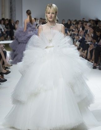 Ariana Grande no se caracteriza por la discreción, por lo que un hermoso vestido de novia de Giambattista Valli podría ser una alternativa para el día de su boda (sobre la cual aún no tenemos mayores detalles). Lo que sí sabemos es que los tules y el volumen son algo que no debería faltar en el vestido de novia de Ariana Grande en 2021. Tomando inspiraciones de pasarela podemos acercarnos a un vestido como este: