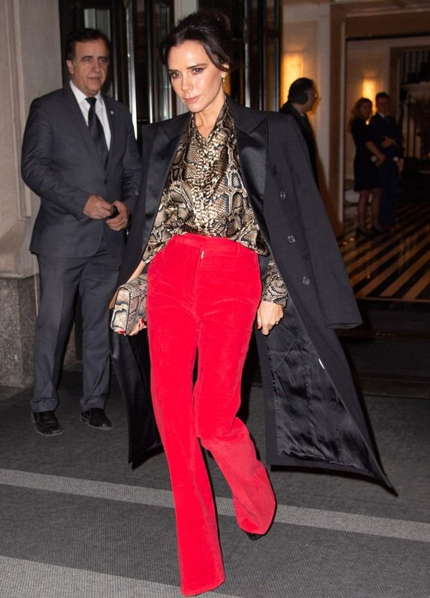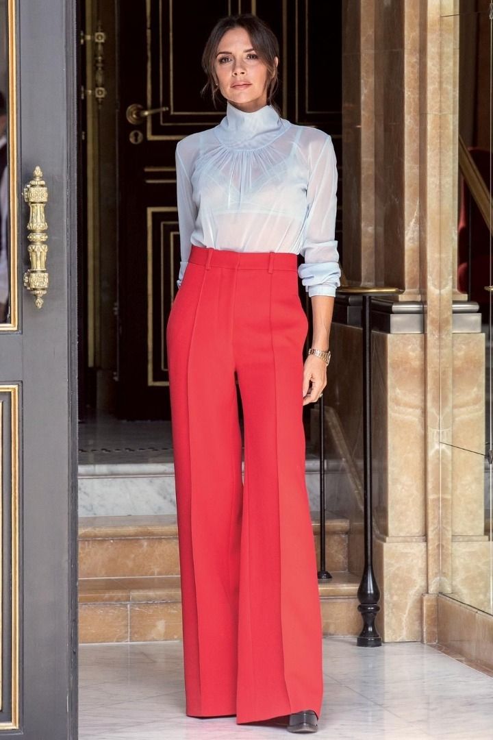 Victoria Beckham ha sido captada en diferentes ocasiones utilizando este modelo de pantalón acampanado y lo único que varía es el color, en otra imagen se puede observar que combinó un pantalón acampanado en color rojo con una camisa blanca de mangas largas, puedes jugar con las combinaciones todo queda a tu creatividad, dependiendo de la ocasión que desees utilizarlos los pantalones acampanados siempre te van a favorecer.