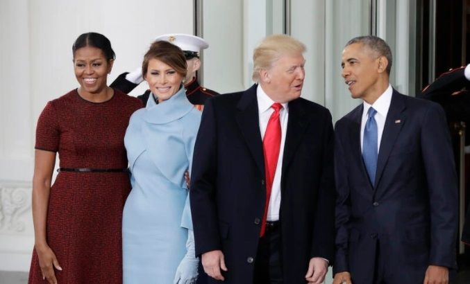 En esta foto en que vemos a los cuatro protagonistas del día, notamos el contraste de looks entre Melania y Michelle: Michelle luce sencilla, clásica, cómoda y simple; Melania opta por un conjunto más elegante y llamativo.