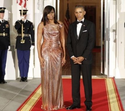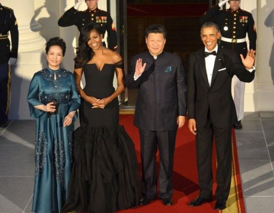Y por aquí, otra excelente combinación: en una foto en que aparecen cuatro personas es imposible no desviar la mirada hacia Michelle Obama y su espectacular elección de escote abierto de Vera Wang. En este caso, Michelle acompañó a Barack Obama a un encuentro con Xi Jinping, presidente de China; y Madame Peng Liyuan.