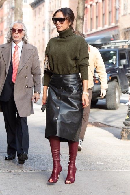 Las prendas en cuero serán estarán muy presentes durante esta temporada y la falda midi será una de las protagonistas. Las mismas son ideales para combinar perfectamente con jersey clásicos, una blusa o camisa románticas y darle ese toque diferente con una chaqueta tipo cárdigan. Pero, para darle un toque moderno puedes apostar por unas botas altas como las cañas arrugada, mejor conocidas como “slouchy”.