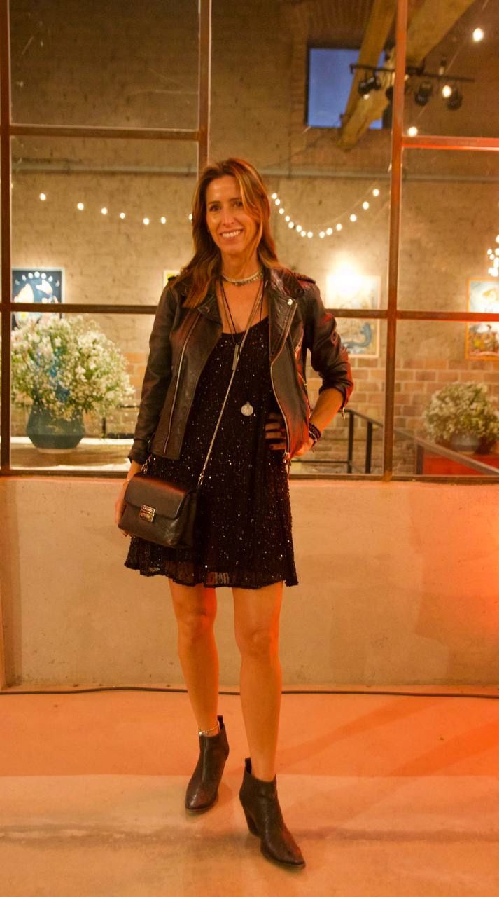 La abogada María Frugoli apostó por un look súper juvenil y elegante. Eligió un outfit total black, con un vestido corto lleno de brillos, que bajó con una campera de cuero y botas cortas.