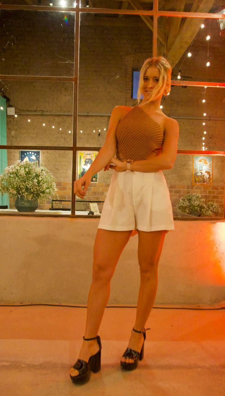 Ella apostó por la combinación perfecta de colores neutros: blanco, negro y marrón. El short de tiro alto con el top de punto son un sí indiscutido. La espalda estaba totalmente descubierta, en este look tan sensual como chic.