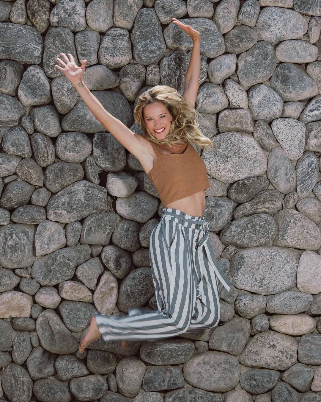 Finalmente, otro look súper juvenil se forma gracias a unos pantalones pijama. Ella eligió unos altos, con nudo en la cintura e hizo otra combinación genial con un crop top. Esto descomprime muchísimo el atuendo y permite mostrar piel, lo cual además estiliza inmediatamente.