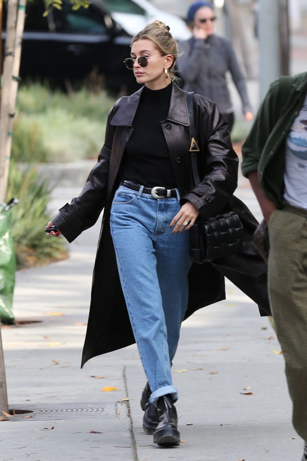 Hailey Bieber ha sido la reina de las tendencias 2021 y no podía faltarle un look con tapado de cuero. En esta ocasión usó unos jeans bootcut con un sweater negro de cuello alto, botas chunky negras, gafas de sol y bolso negro acolchado. Un look en el que puedes usar tu tapado sin lucir tan elegante.